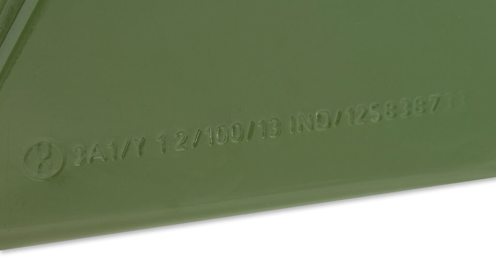 • UN tested and certified to group 2 levels to include flammable liquids. Each can is stamped with the individual UN certification number: 3A1/Y 1.2/100.13 IND/125836580